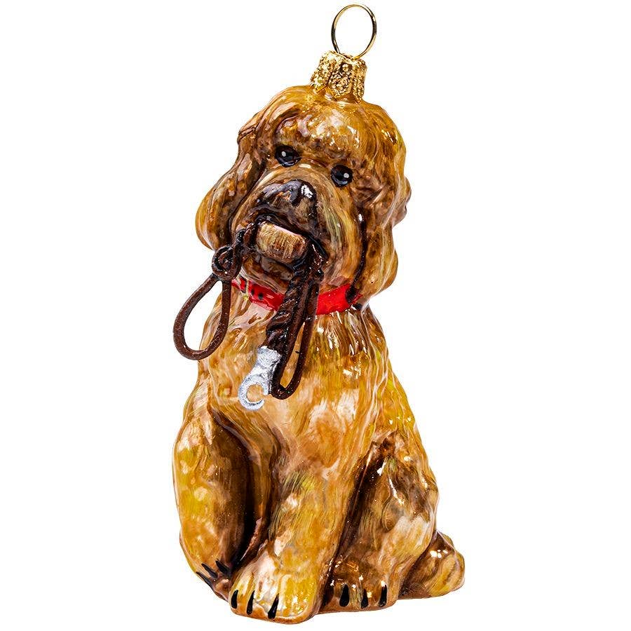 Pryd din julgran eller annan plats i hemmet med denna vackra labradoodle julprydnad / julkula av glas. Den är handtillverkad och handmålad så det kan skilja sig lite från bilden.