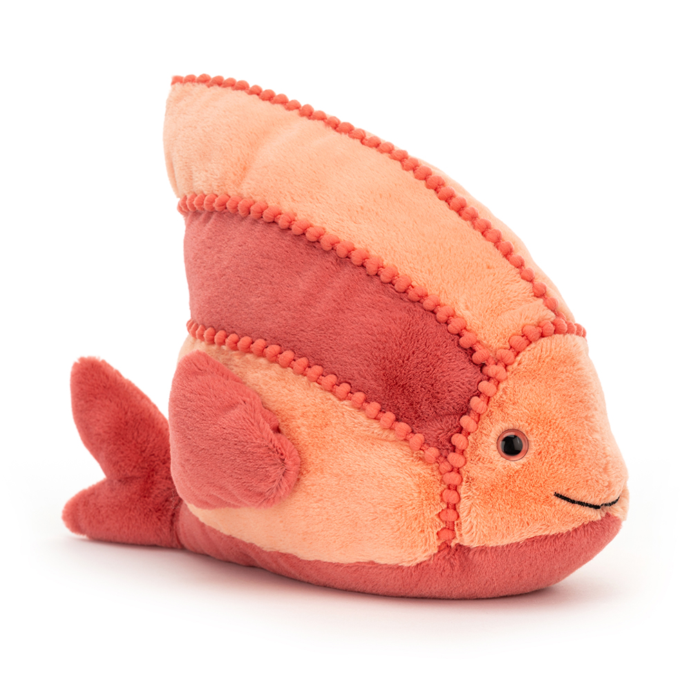 En glad och färggrann mjuk tropisk fisk som livar upp sin omgivning. Denna gosiga fisk har breda ränder i persiko-orange och korallrött med små garnbollar som utsmyckning, en svepande stjärtfena, viftande fenor, orange ögon och ett varmt leende. En god kompis att dansa eller mysa med. Handtvättas vid behov.