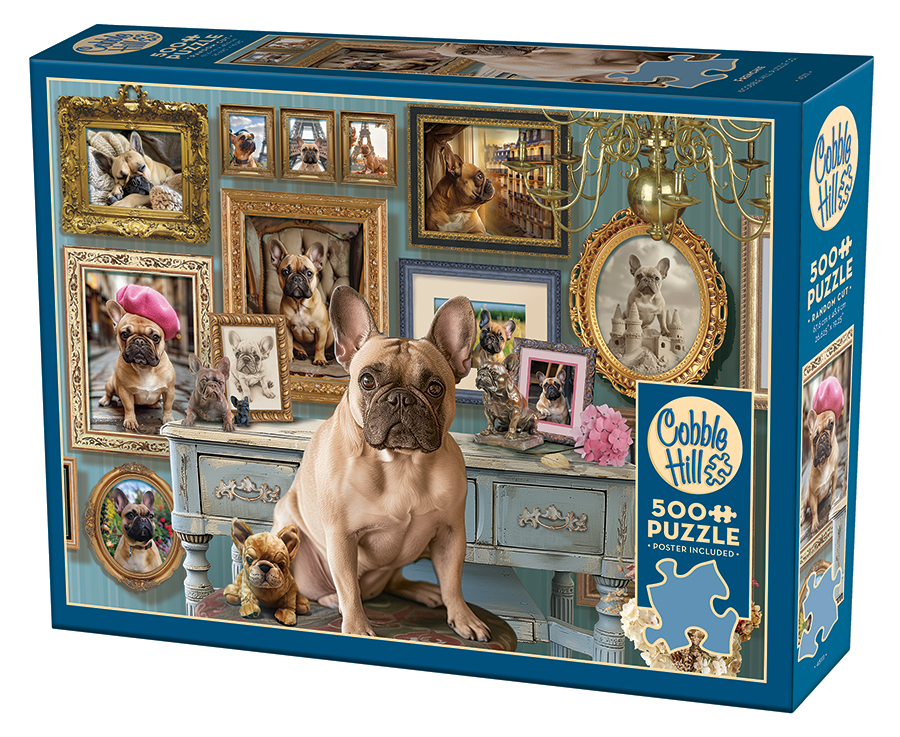 500-bitars pussel från Cobble Hill! Motivet visar många franska bulldoggar. Färdigt mått är ca 49 x 68 cm.