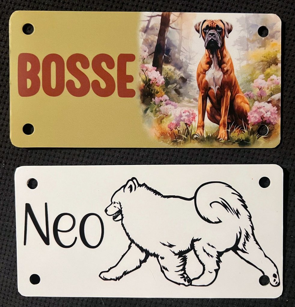 Väldigt söt skylt som du själv väljer foto samt text/namn på. Perfekt att sätta på hundbur/grind/stängsel/barnvagn - var som helst där det går att fästa en skylt. Det finns fyra hål så att ni lätt kan fästa den med stripes/buntband etc. Storlek är 15 cm x 7,5 cm och materialet är av aluminium. Skylten är ca 1,5 mm tjock.