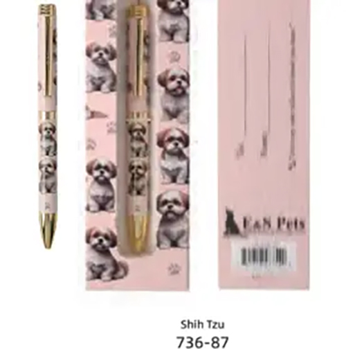 Varje penna kommer i en matchande tryckt presentask och pennan i sig har ett fint hundrasmotiv, mjuk skrivkvalitet och är påfyllningsbar.