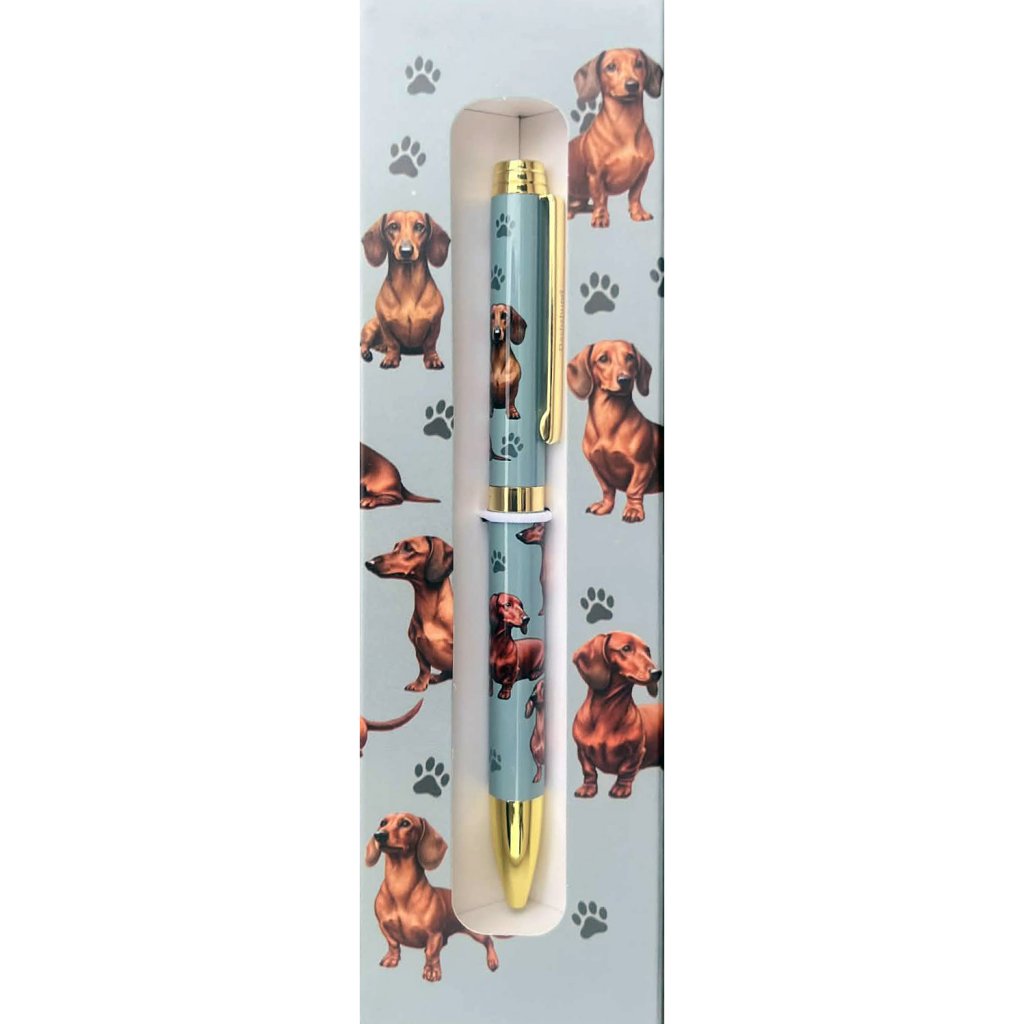 Varje penna kommer i en matchande tryckt presentask och pennan i sig har ett fint hundrasmotiv, mjuk skrivkvalitet och är påfyllningsbar.