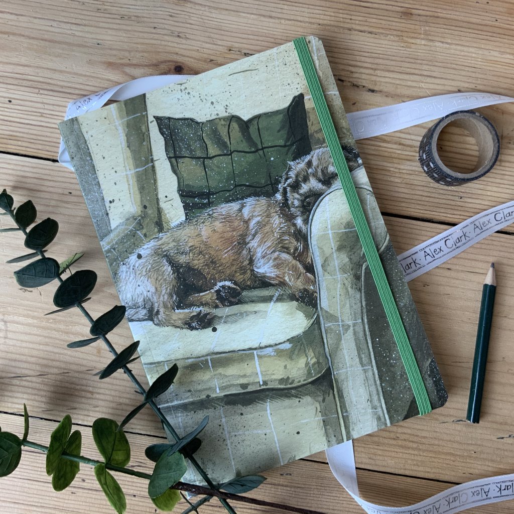 Söt anteckningsbok med borderterriermotiv, målat av Alex Clark. 96 linjerade sidor. Storlek är ca 21 x 15 cm.